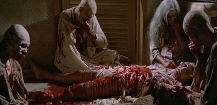 Zombivyöryn alkaessa ohjaajamestari Fulcin omimmat klassikkotemput pääsevät vihdoin oikeuksiinsa, ja popcorniin meinaa jo tukehtuakin silkasta viihde-elämyksen tuottamasta henkisestä orgamista. Heti alkajaisiksi katsojalle näytetään paljasta pintaa ja väkivaltaa – molemmat ohjaajan tavaramerkkejä. Fulci ei tunnetusti naissukupuolesta välittänyt, joten pitkälle seksualisoitujen emäntien silpominen ja pahoinpiteleminen korostuivat tämän elokuvissa kuin rusinat pullissa. Tällä haavaa emäntä saa äärimmäisen graafisessa kuolinkohtauksessa piikinkin silmäänsä ennen päätymistään zombien popsittavaksi. Saman kohtalon kokee retkikunnan toinen naisjäsen, joskin sillä kertaa vaatetettuna ja ilman sadistista kidutusta. Verestä ei ole säästelty.
