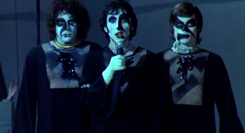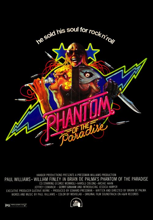 De Palman tarkoituksena lienee aikansa populäärikulttuurin feikkiyden ja campin korostaminen. Phantom of the Paradisen koko ulkoasu näyttääkin vähän kuin Dino de Laurentiisin leffoista napatulta, eikä elokuvan hevimiehillä juuri vaikuttaisi olevan halpaa shokkivaikutelmaa tai opportunismia kaksisempaa sanomaa tai järkeä lauluissaan – sikäli de Palman piikki osuukin monessa suhteessa maaliinsa. Saamaani vaikutelmaa erikseen korostaa Faustista, Oscar Wildeltä ja Oopperan kummituksesta napatuista aineksista koottu pastissimainen tarina. Tuttujen kauhutarinoiden viittausten bongaaminen onkin hauskaa ja palkitsevaa. Kuin Spinal Tappiä enteillen myös Phantom of the Paradisen artistit vaihtelevat tyyliään summittaisesti muodin mukana. Show-bisnes on likaisinta liiketoimintaa maan päällä.